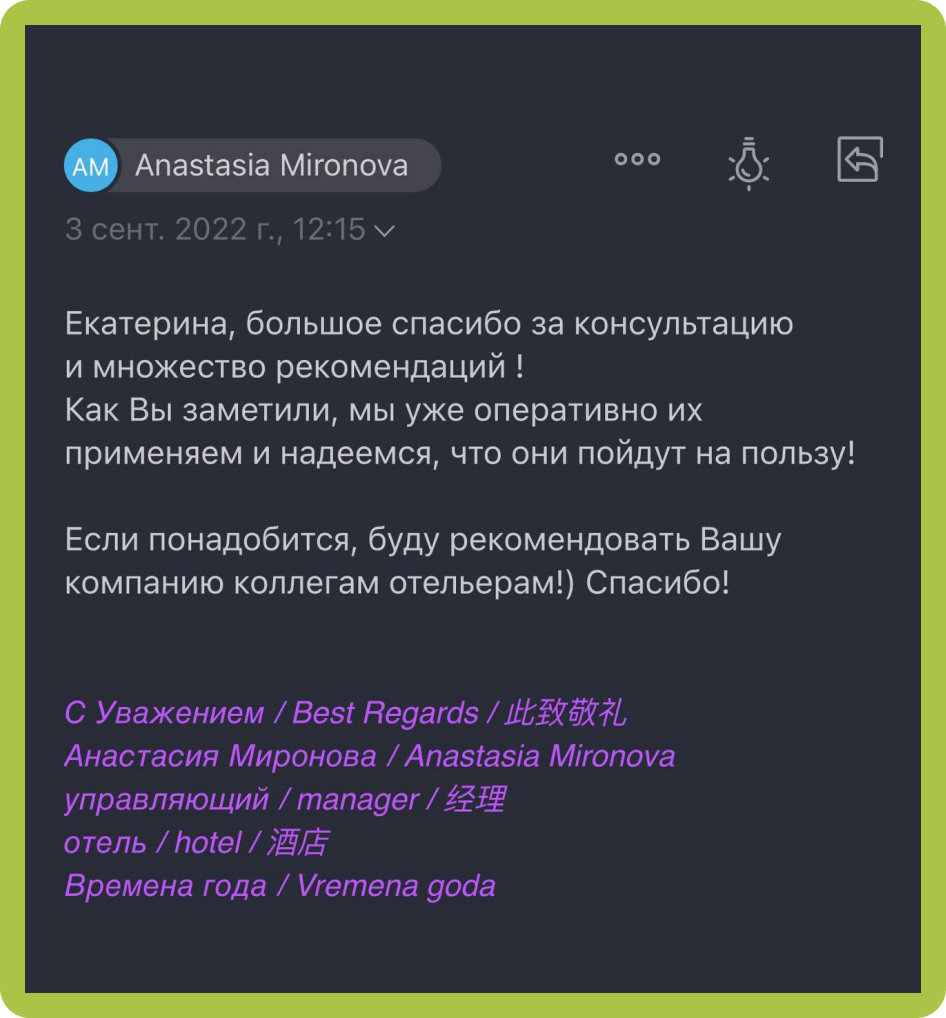 Мы предлагаем отельерам услуги наставничества от основателя компании Екатерины Шмыголь