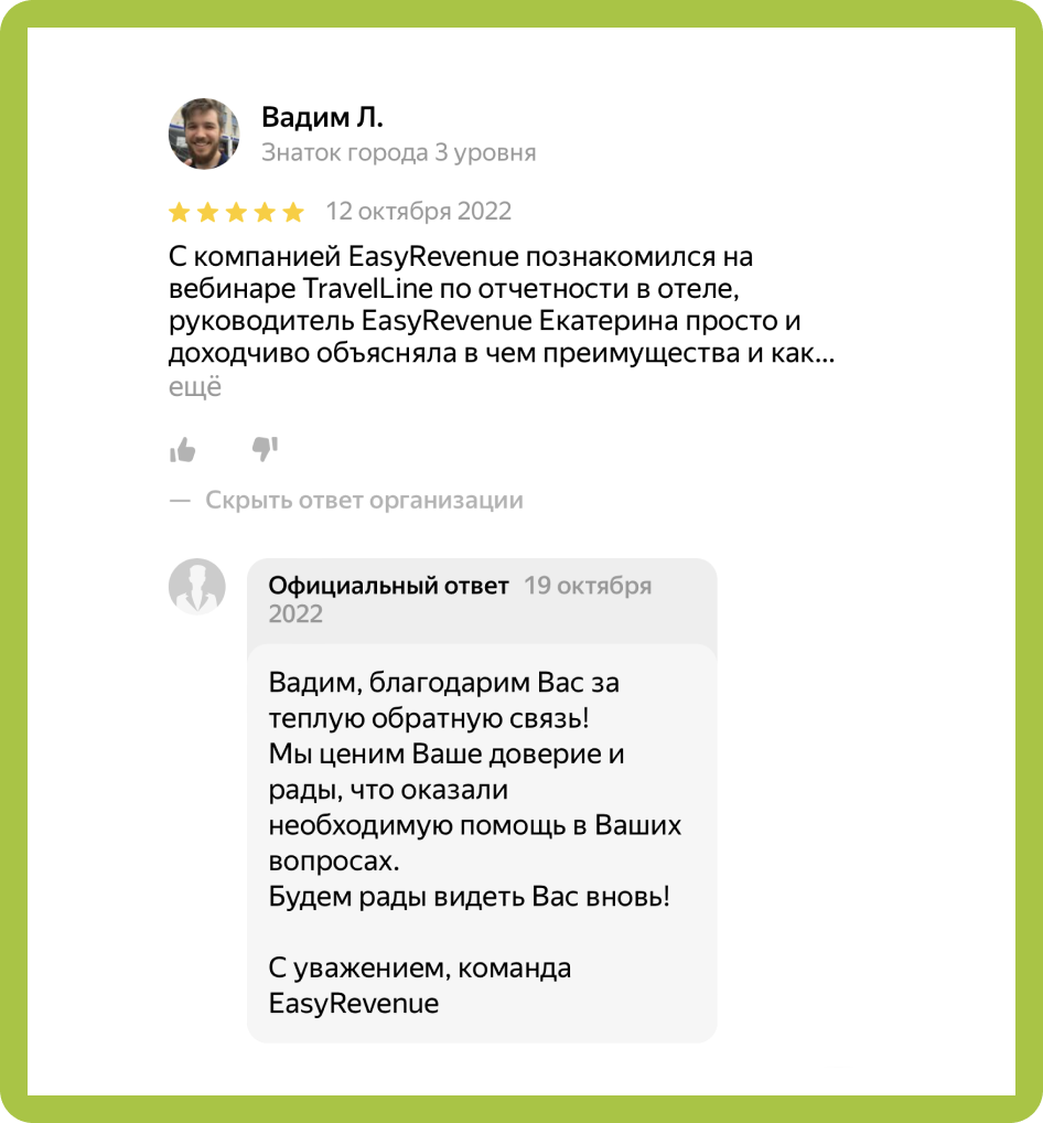 Наша цель - увеличение доходности вашего объекта размещения. Верим, что каждый бизнес уникален. Команда наших специалистов применяет индивидуальный подход и предлагает различные услуги для достижения ваших лучших результатов, среди них: revenue management, аналитика продаж, операционная деятельность, маркетинг и многое другое.